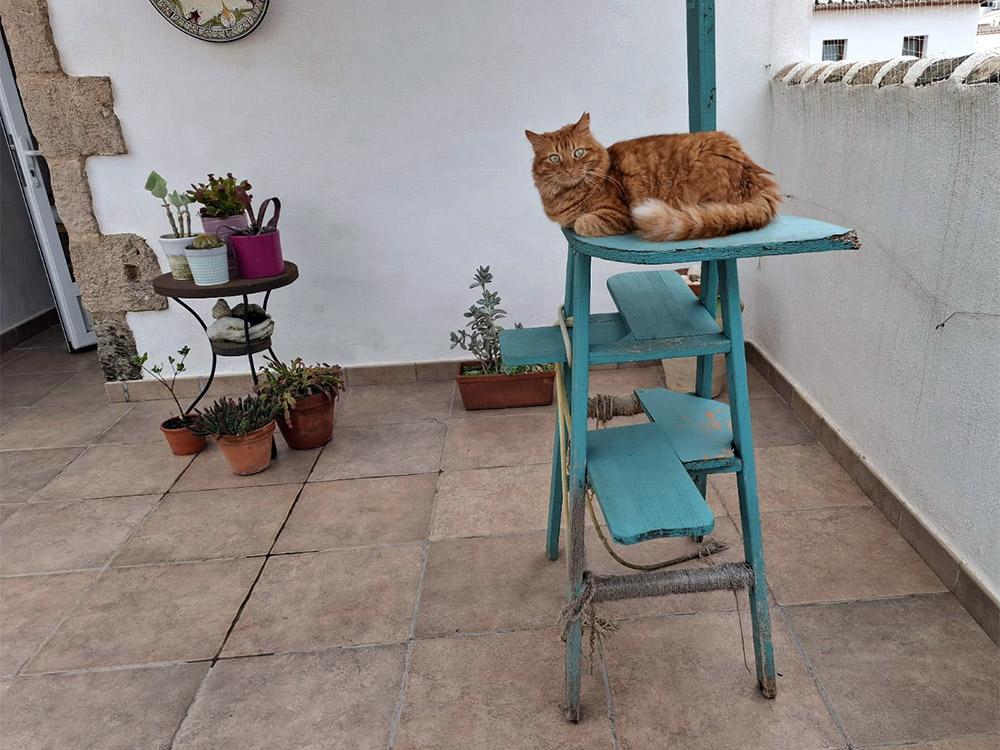 Poor Modou had to scale the highest tree. We were prepared! As the cat fell towards the blanket, it frantically searched for an escape route but ended up heading towards a wall.